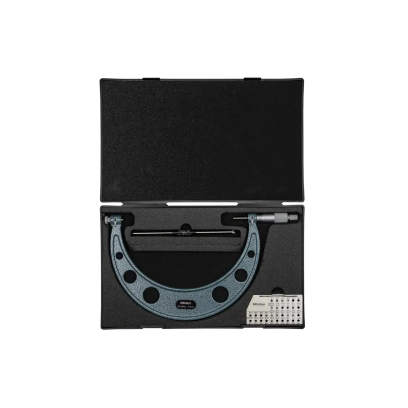 The Mitutoyo 126-132 screw thread micrometer is an analog (vernier) tool with an interchangeable anvil-spindle tip system for measuring the pitch diameter of various screw threads. Interchangeable anvils are sold separately.