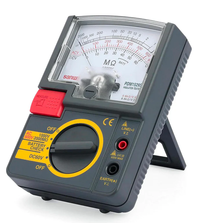 DescriptionThe Sanwa PDM1529S is a portable analog insulation tester used for measuring the insulation resistance of electrical equipment and wiring. It features three different DC test voltage ranges and can also measure AC and DC voltage. |
