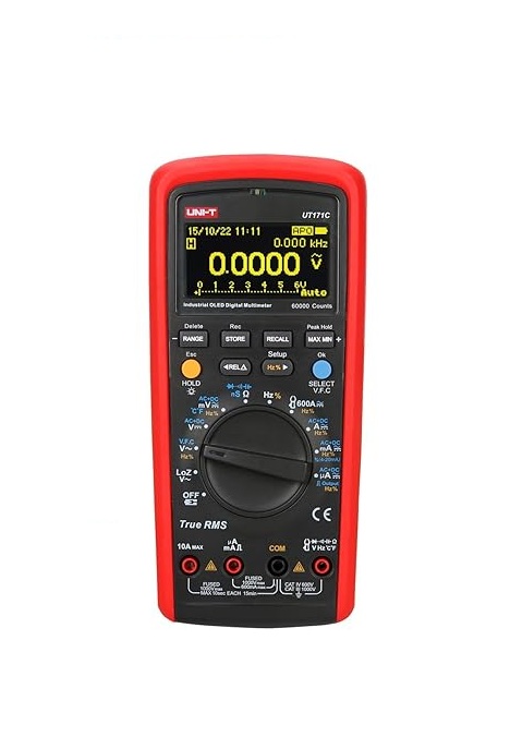 Description: UT171 series are industrial grade multimeters used by professionals. Its built-in square wave output is useful for troubleshooting industrial control signals. Its LoZ (ACV) feature can be used to identify residual (ghost) voltage in large capacitors. UT171C’s OLED display is perfect for working in low temperatures down to -30°C.