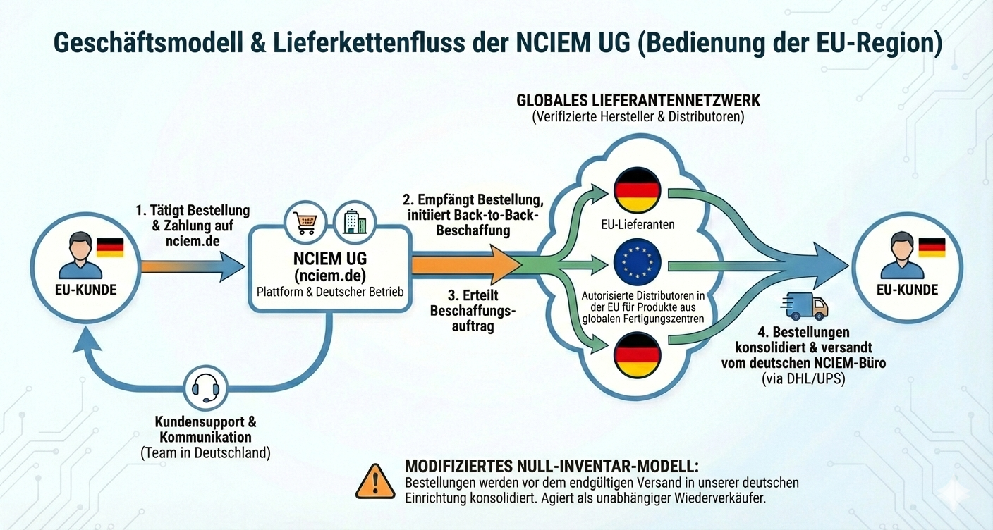 NCIEM UG betreibt nciem.de ausschließlich für Kunden innerhalb der EU. Wir verfolgen ein Null-Lagerbestandsmodell und betreiben keinen Drop-Shipping-Marktplatz. Stattdessen verwenden wir einen Just-in-Time-Beschaffungsprozess, bei dem die Beschaffung erst nach Bestätigung einer Bestellung ausgelöst wird.